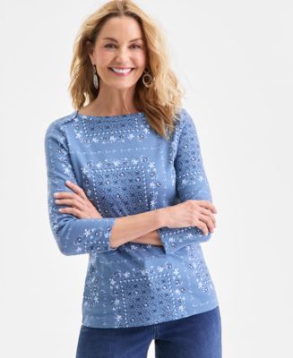 스타일 & 코의 프린트 피마 면 블라우스, 맥시 편점 독점 3/4 소매와 보트넥 디자인으로 세련된 분위기 연출 부드러운 피마 면 소재로 통기성과 편안함을 제공