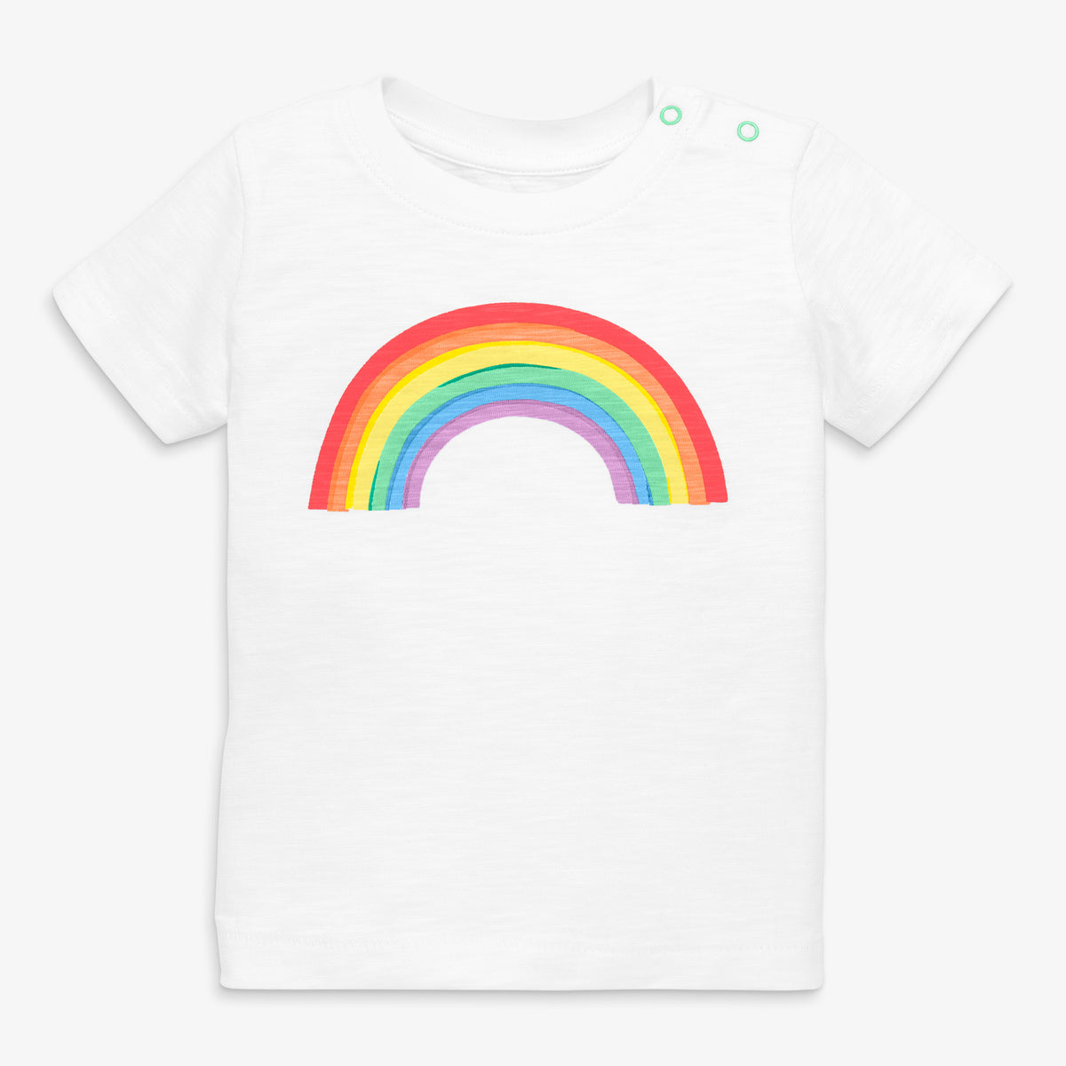 정가 $16.50에서 약 60% 할인된 $6.50에 구매 가능합니다. 밝고 선명한 무지개 그림이 특징인 아기 티셔츠입니다. 클리어런스 세일로 한정 수량 제공됩니다.