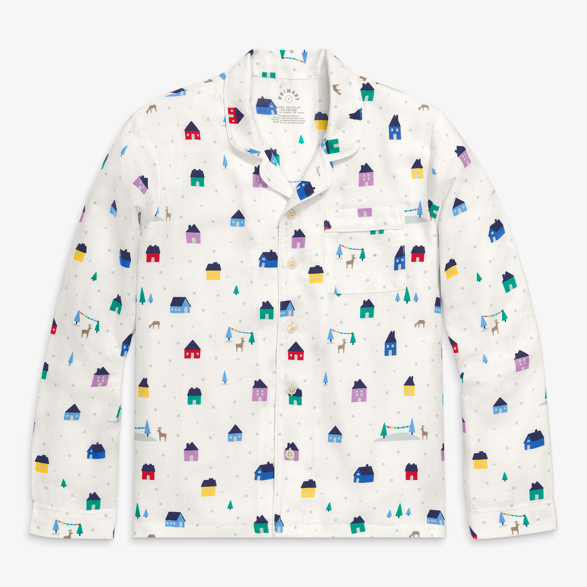 Made 100% 재생 폴리에스테르 원단으로 제작된 이 파자마 탑은 부드럽고 따뜻합니다. 정가 $54.50에서 50% 할인되어 $27.25에 판매되고 있습니다. 부드러운 소재와 귀여운 무지개 마을 디자인으로 많은 사랑을 받고 있습니다.