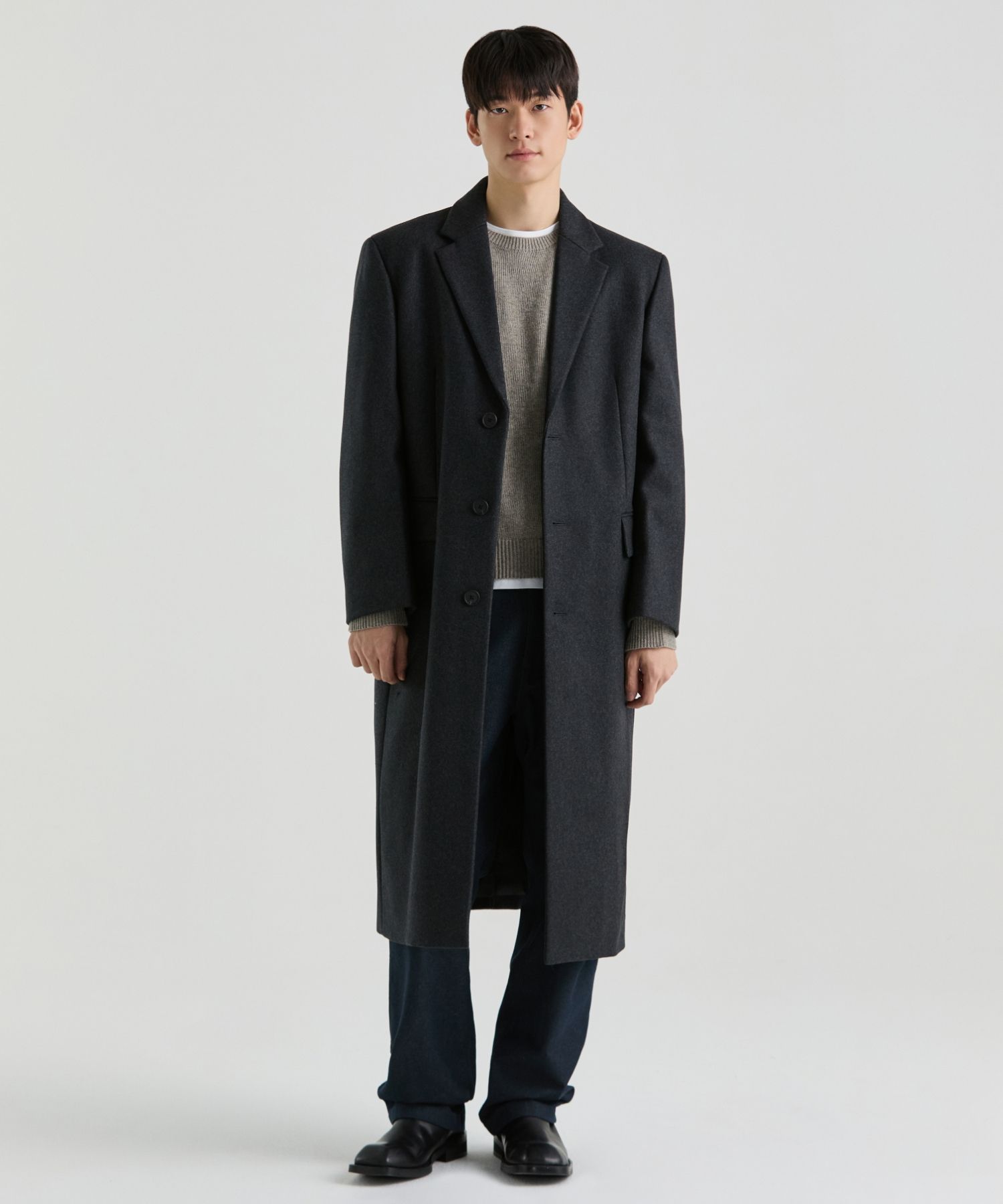 무신사 스탠다드 프리미엄 MTR DADDY 어깨 단추 코트 차콜 그레이